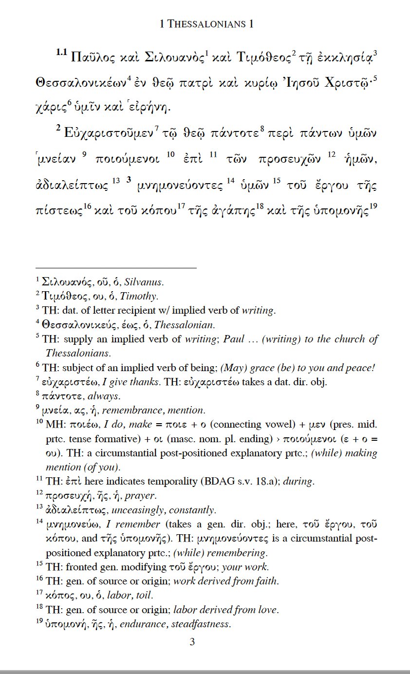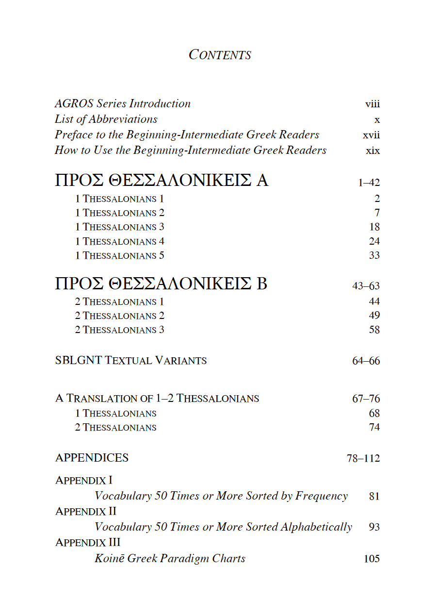 1–2 Thessalonians: A Beginning-Intermediate Greek Reader is a Tier 3 GlossaHouse resource in the Accessible Greek Resources and Online Studies (AGROS) series. Tier 3 resources are designed to build confidence in understanding Greek and to encourage the reading of the Greek New Testament by providing: