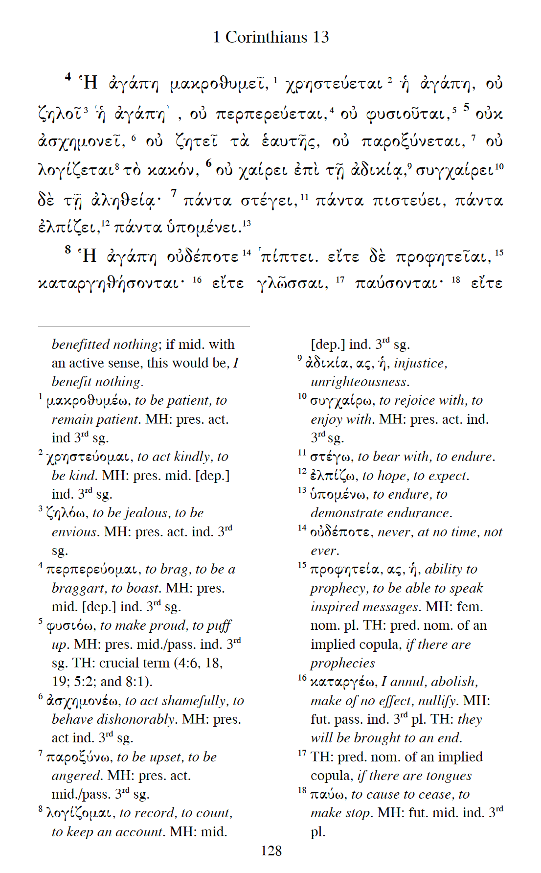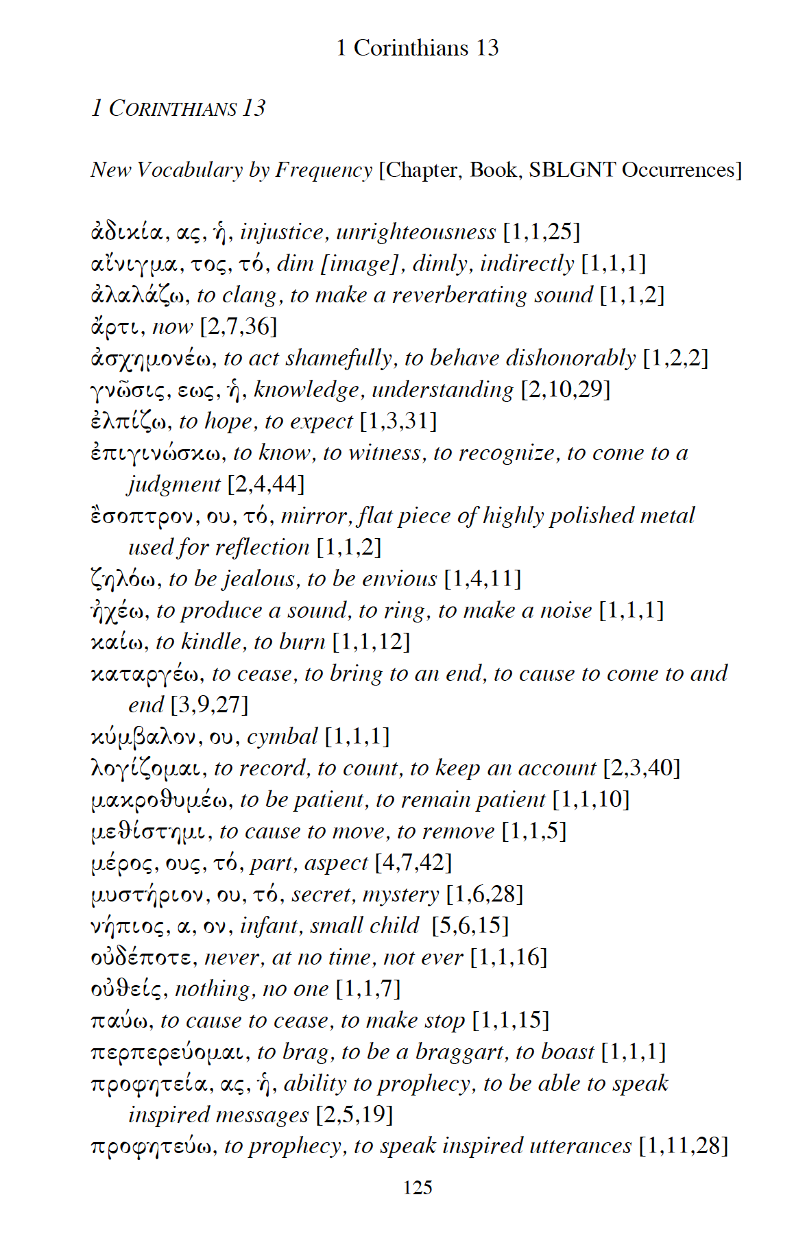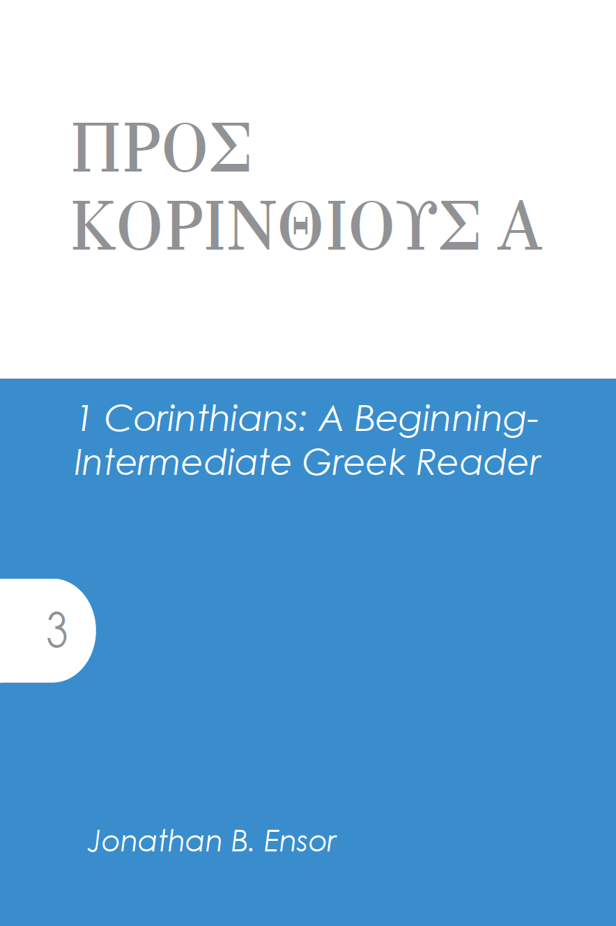 1 Corinthians: A Beginning-Intermediate Greek Reader by Jonathan B. Ensor is a Tier 3 GlossaHouse resource in the Accessible Greek Resources and Online Studies (AGROS) series. These Beginning-Intermediate Greek Readers are user-friendly guides for reading based upon The Greek New Testament: SBL Edition (SBLGNT). Each book provides footnotes for all vocabulary words occurring 49 times or less, morphological and translational helps, and variants between SBLGNT and the standard critical editions of the Greek NT. Additionally, each chapter is introduced with a list of these infrequent vocabulary words that occur within the chapter. The list is sorted by word frequency as found in the chapter, arranged from most to least frequent.