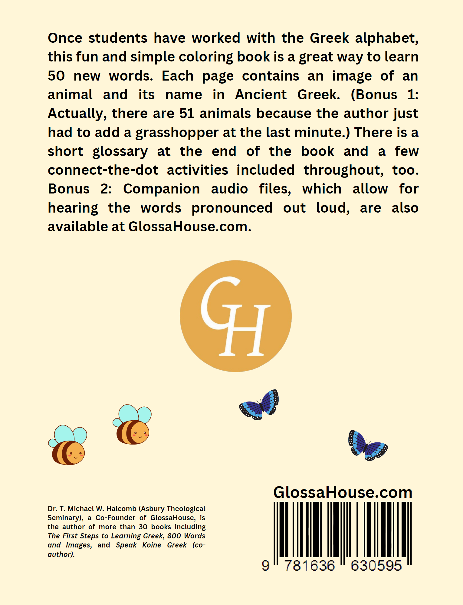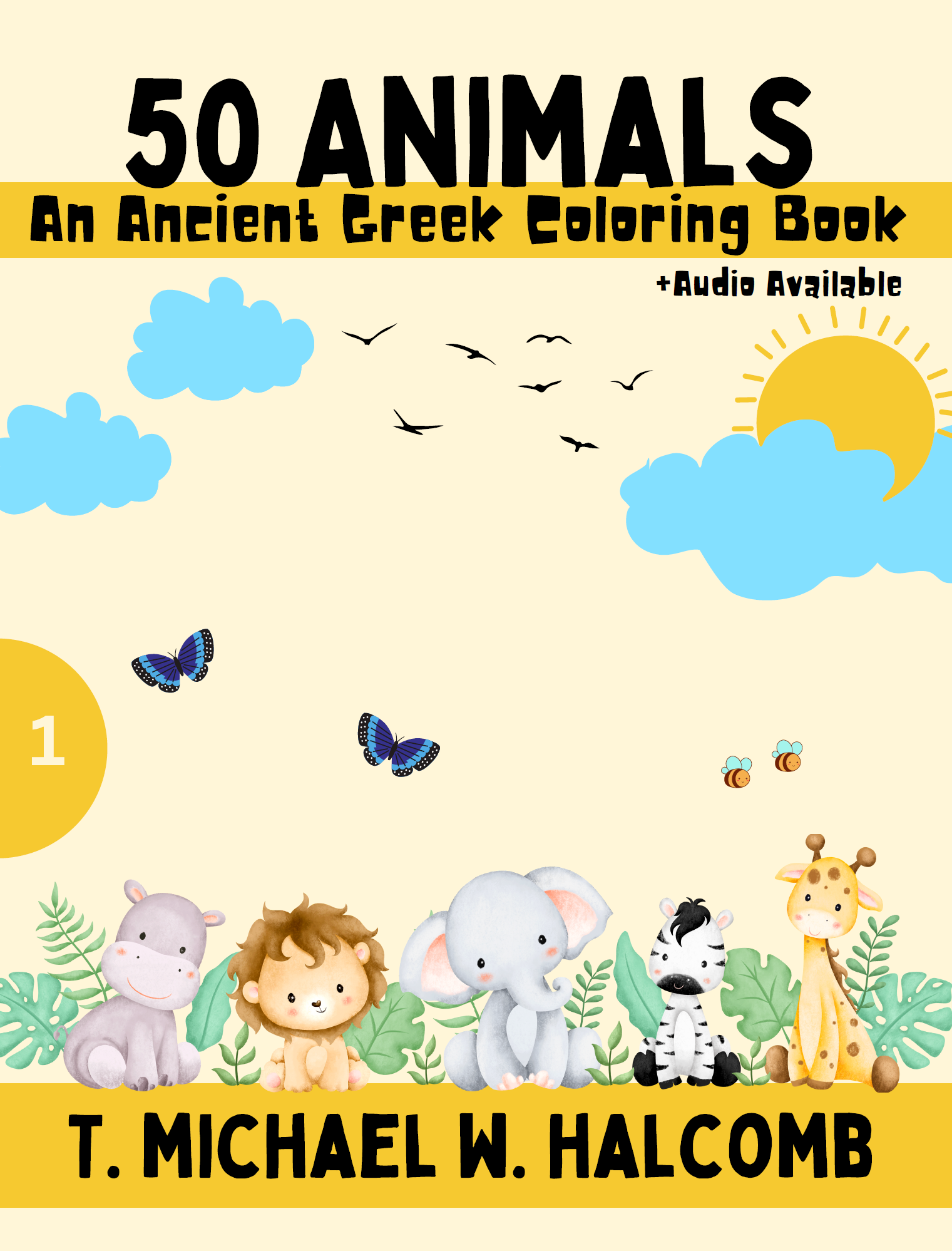 Once students have worked with the Greek alphabet, this fun and simple coloring book is a great way to learn 50 new words. Each page contains an image of an animal and its name in Ancient Greek. (Bonus 1: Actually, there are 51 animals because the author just had to add a grasshopper at the last minute.) There is a short glossary at the end of the book and a few connect-the-dot activities included throughout, too. Bonus 2: Companion audio files, which allow for hearing the words pronounced out loud, are also available at GlossaHouse.com.