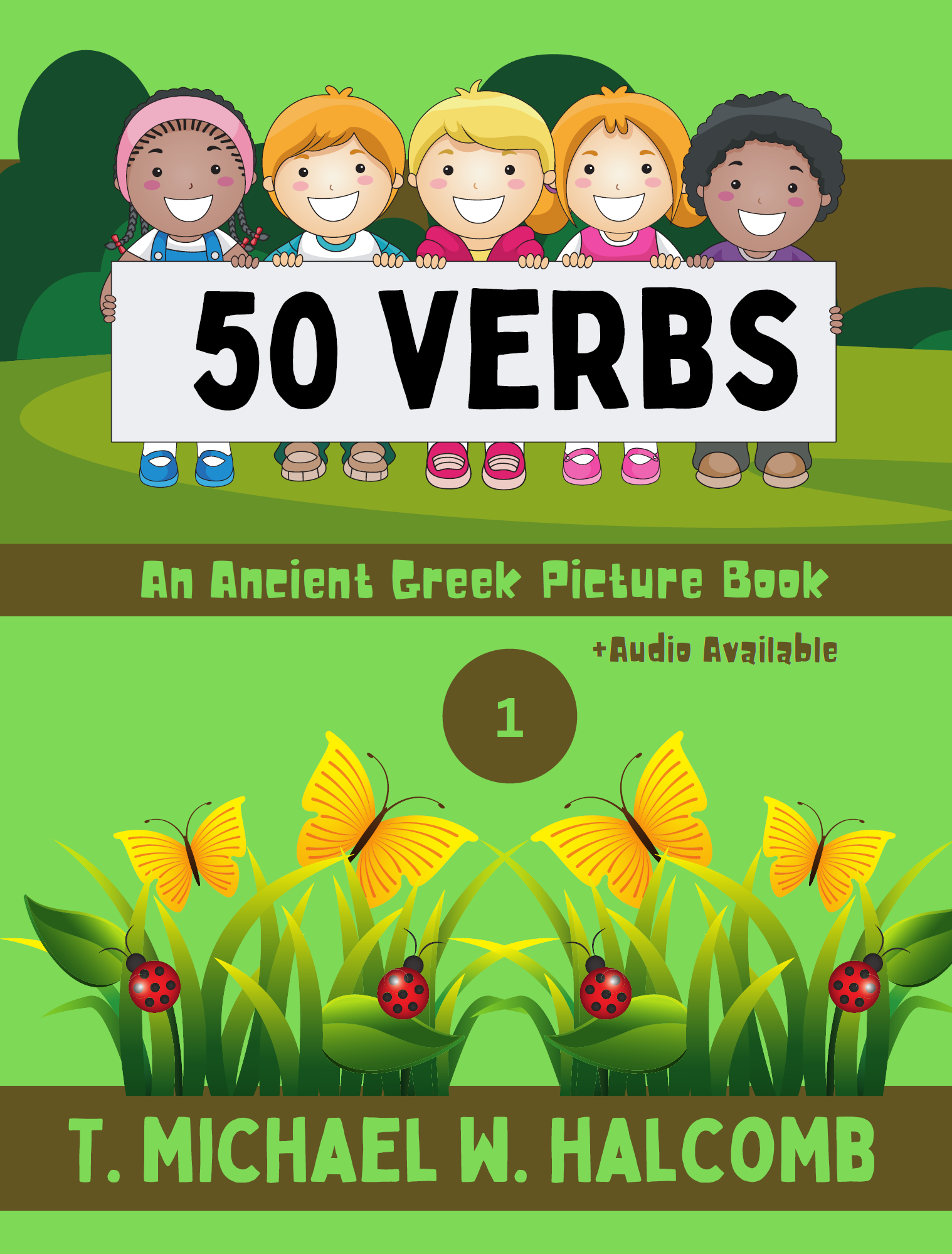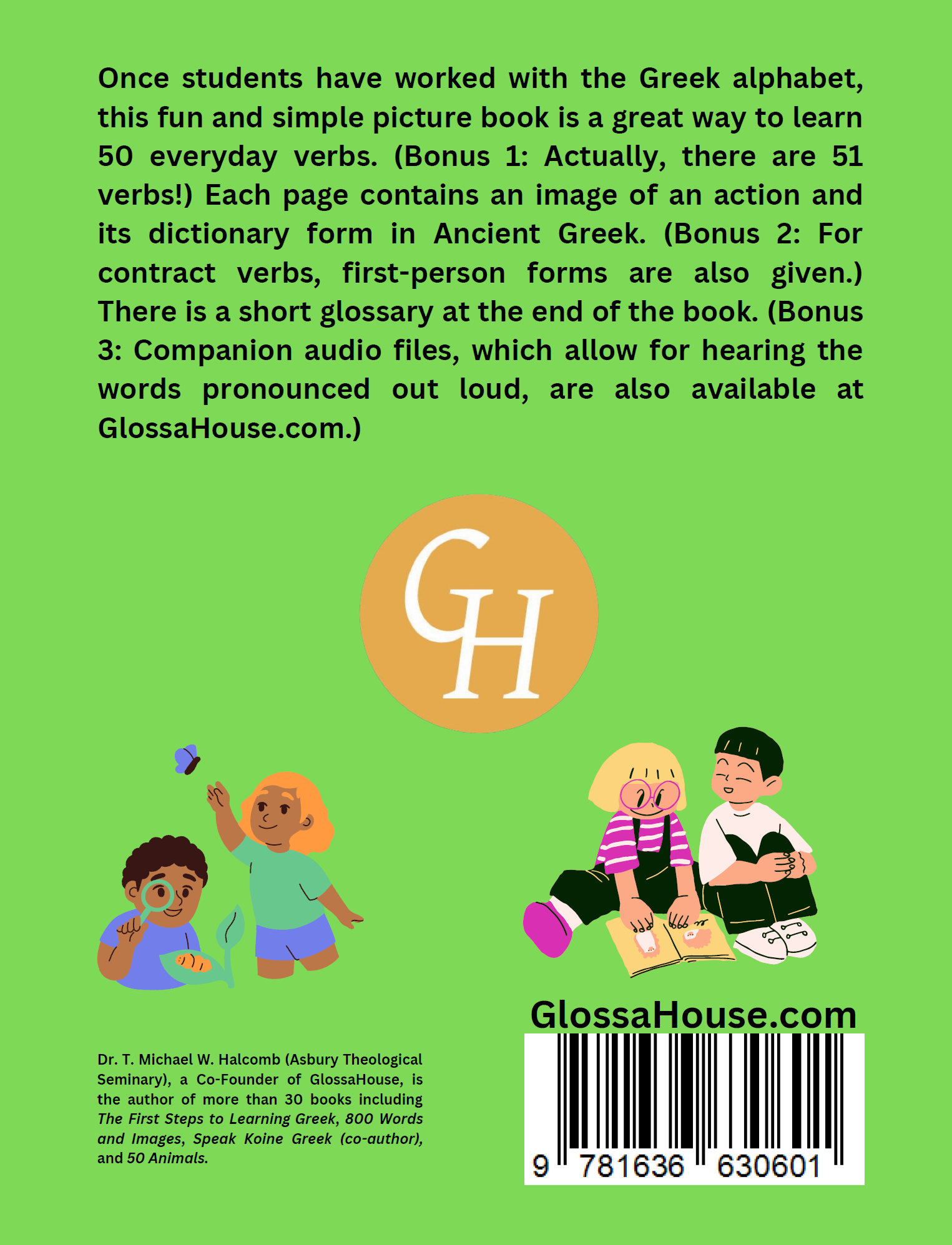 Once students have worked with the Greek alphabet, this fun and simple picture book is a great way to learn 50 everyday verbs. (Bonus 1: Actually, there are 51 verbs!) Each page contains an image of an action and its dictionary form in Ancient Greek. (Bonus 2: For contract verbs, first-person forms are also given.) There is a short glossary at the end of the book. (Bonus 3: Companion audio files, which allow for hearing the words pronounced out loud, are also available at GlossaHouse.com.)