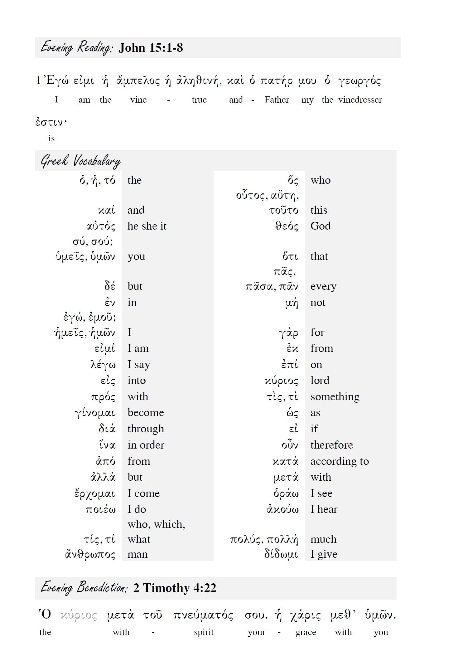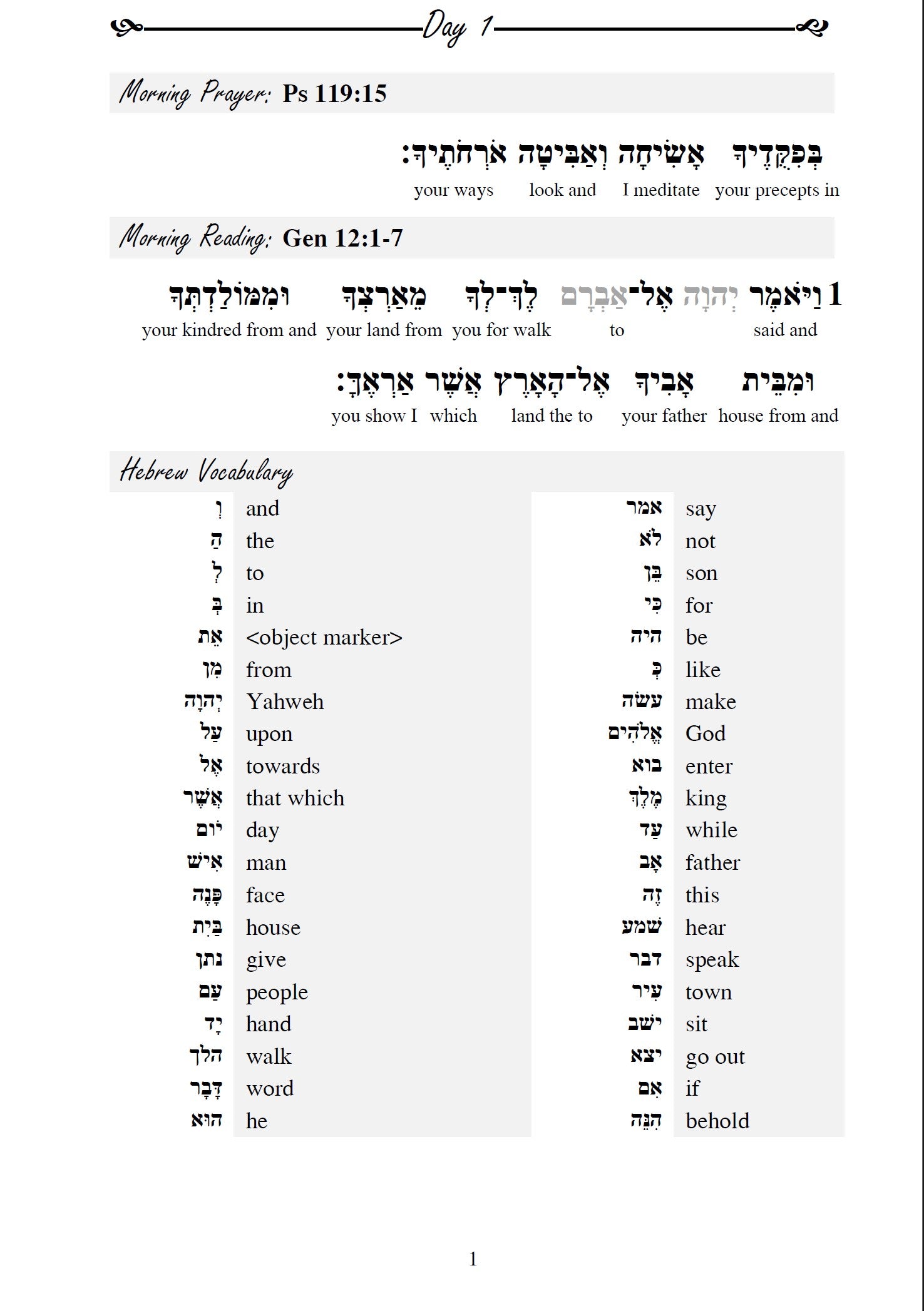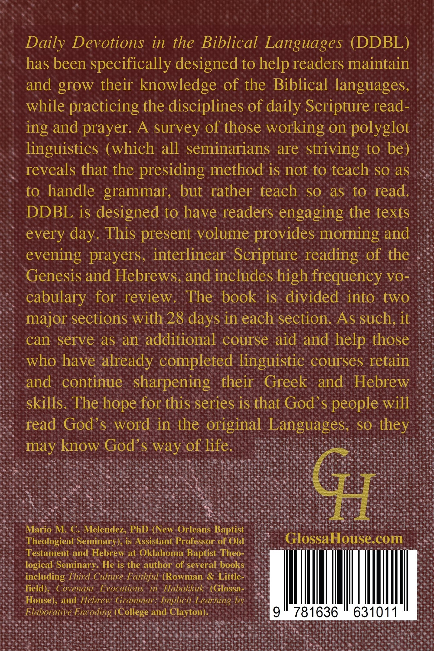 Daily Devotions in the Biblical Languages (DDBL) has been specifically designed to help readers maintain and grow their knowledge of the Biblical languages, while practicing the disciplines of daily Scripture reading and prayer. A survey of those working on polyglot linguistics (which all seminarians are striving to be) reveals that the presiding method is not to teach so as to handle grammar, but rather teach so as to read. DDBL is designed to have readers engaging the texts every day. This present volume provides morning and evening prayers and interlinear Scripture reading of the Genesis and Hebrews with high frequency vocabulary for review. The book is divided into two major sections with 28 days in each section. As such, it can serve as an additional course aid and help those who have already completed linguistic courses retain and continue sharpening their Greek and Hebrew skills. The hope for this series is that God’s people will read God’s Word in the original languages so that they would know God’s way of life.