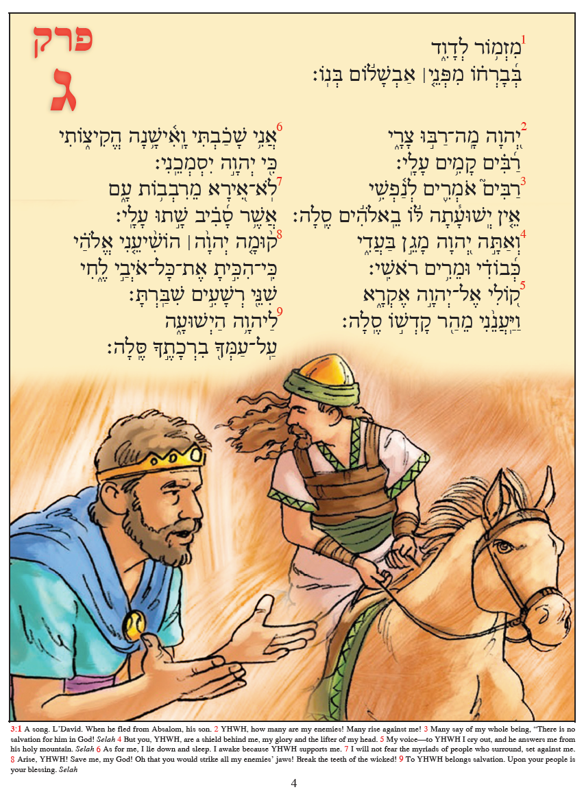 Illustrated Psalms 1–72 in Hebrew belongs to the series GlossaHouse Illustrated Biblical Texts (GIBT) that presents the books of the Bible in their original languages, embedded scene by scene in the context of Keith R. Neely’s evocative, full-color illustrations. These innovative resources will accelerate your comprehension by helping you distinguish narrative from dialogue at a glance. The illustrations provide visual cues for action, tension, and emotion, inviting an immersive reading experience in the ancient languages. While the books are supported by an original English translation on each page, the graphic approach of the GIBT series pushes against a tendency in biblical language learning to make translation the end goal. On the contrary, we hope that these books will help you begin to think in the biblical language—to hear echoes of the authors’ own voices, thick with the accents of their ancient dialects. Whether you are a beginning student of biblical languages, or an accomplished scholar, our hope is that this fresh presentation of the ancient texts will ignite your imagination and turn the world of these words into an expansive, multicolored landscape in your mind’s eye.