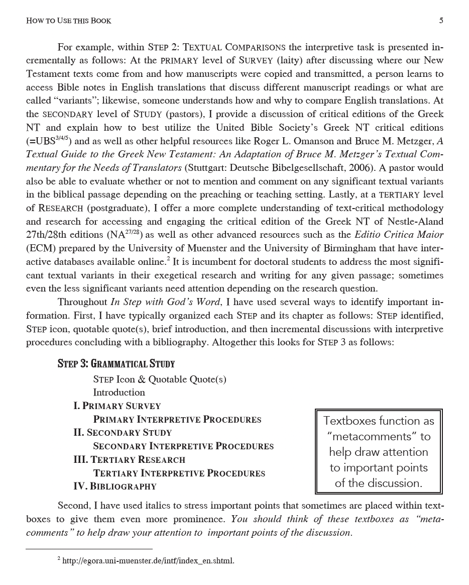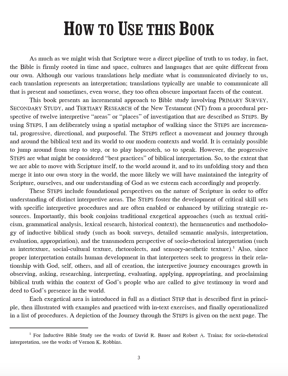 Studying Scripture is not just for pastors or teachers; it's for all of God’s people. This is an honor, a privilege, and a humble service for the whole world. This book presents three levels of study for lay persons, pastors, and postgraduate students. In essence this book offers a summary of foundational issues followed by “best interpretive practices” across twelve essential areas of study such as contextual location, grammatical study, lexical research, historical context, scriptural correlations (intertextuality), and presentation brainstorm. Hermeneutically, this work utilizes three most fruitful streams of biblical interpretation: traditional historical-critical exegesis, transmodern socio-rhetorical investigation, and classical inductive biblical study. Throughout, readers will find hundreds of charts, illustrations, examples, and in-text exercises that will inform, guide, and provoke careful study of God’s Word.