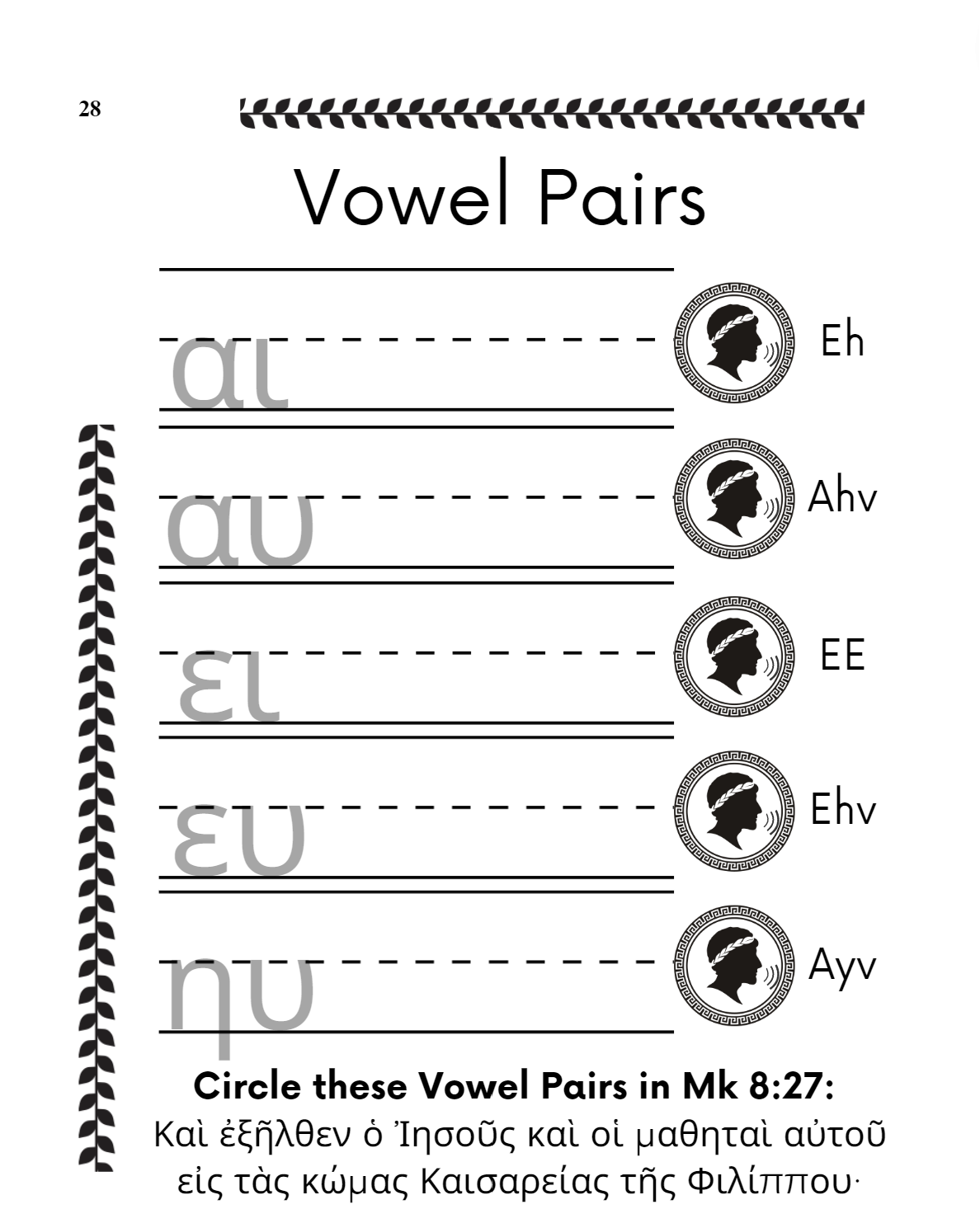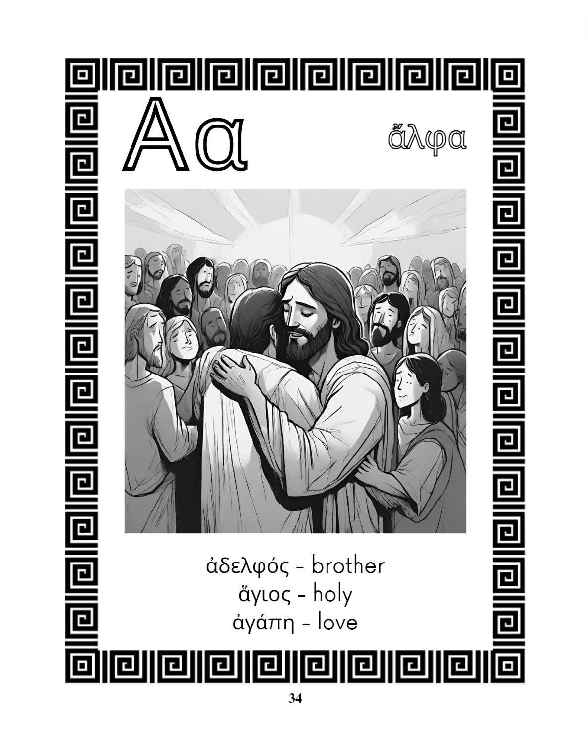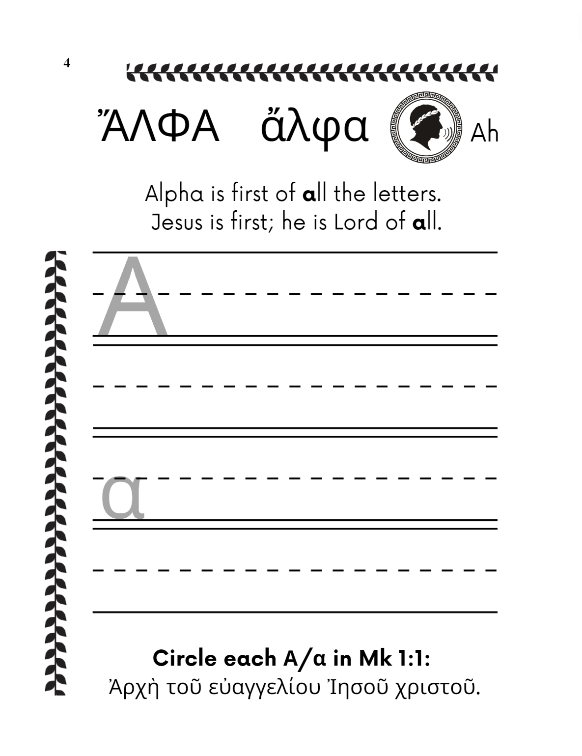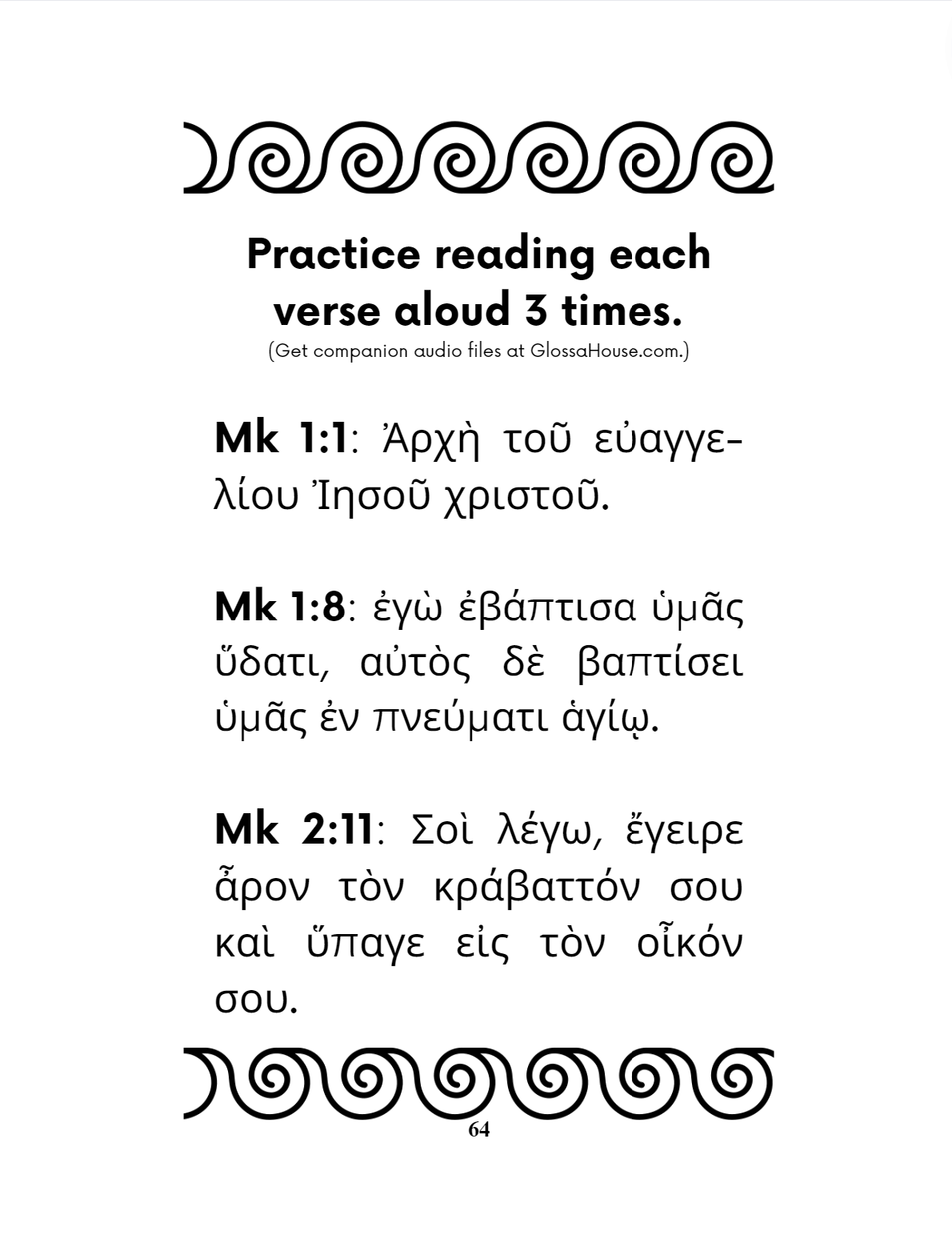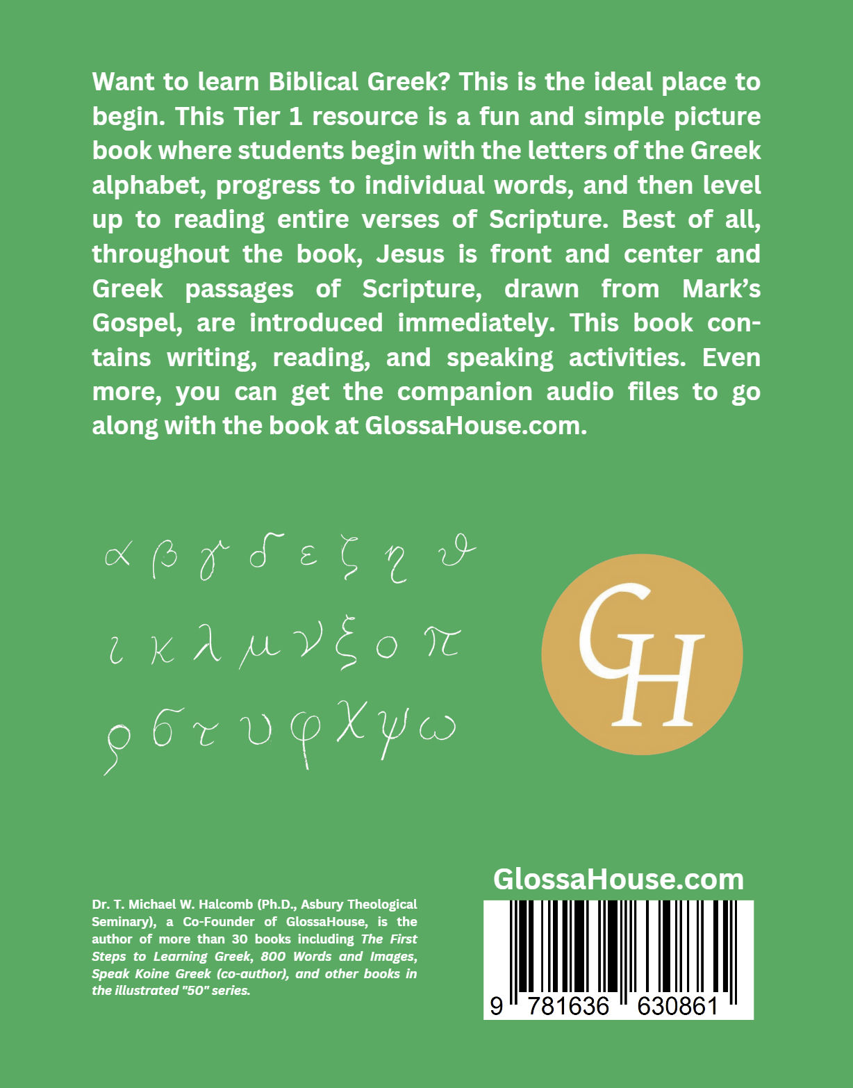 Want to learn Biblical Greek? This is the ideal place to begin. This Tier 1 resource is a fun and simple picture book where students begin with the letters of the Greek alphabet, progress to individual words, and then level up to reading entire verses of Scripture. Best of all, throughout the book, Jesus is front and center and Greek passages of Scripture, drawn from Mark’s Gospel, are introduced immediately. This book contains writing, reading, and speaking activities. Even more, you can get the companion audio files to go along with the book at GlossaHouse.com.
