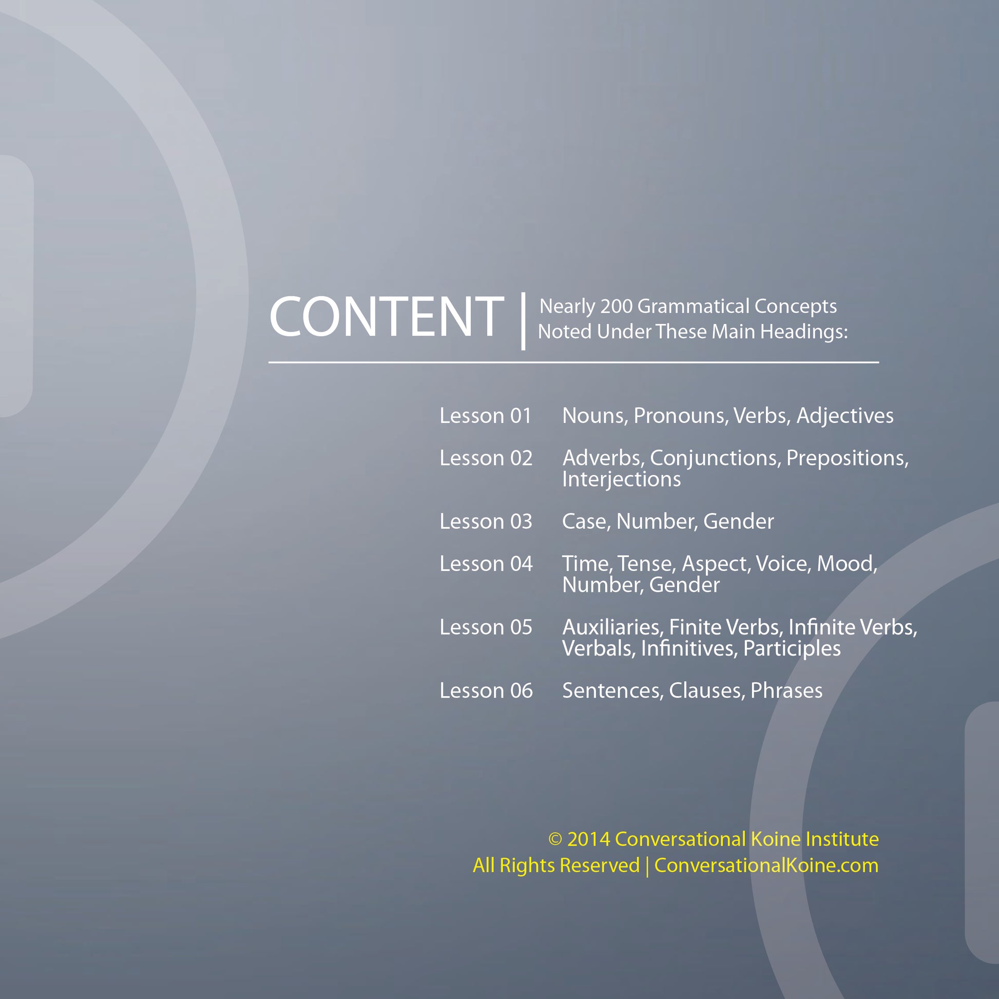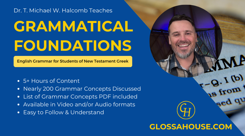 Start Here! Grammatical Foundations: English Grammar for Students of New Testament Greek (A Student-Friendly Video Series). As the title suggests, this resource is video-oriented (for audio, see the sister resource) but also contains pdfs. Created by T. Michael W. Halcomb years ago, this new-old project (forged first under the banner of CKI but now brought to GH) is divided up into 6 main lessons and contains around 5+ hours of grammatical instruction. Each lesson consists of a number of short, user-friendly / student-friendly lessons and takes note of nearly 200 grammatical concepts that English learners / speakers who want to venture into learning Koine Greek should find helpful. We hope these videos will assuage some of the fears that students, especially beginners, have when journeying into learning Koine Greek.