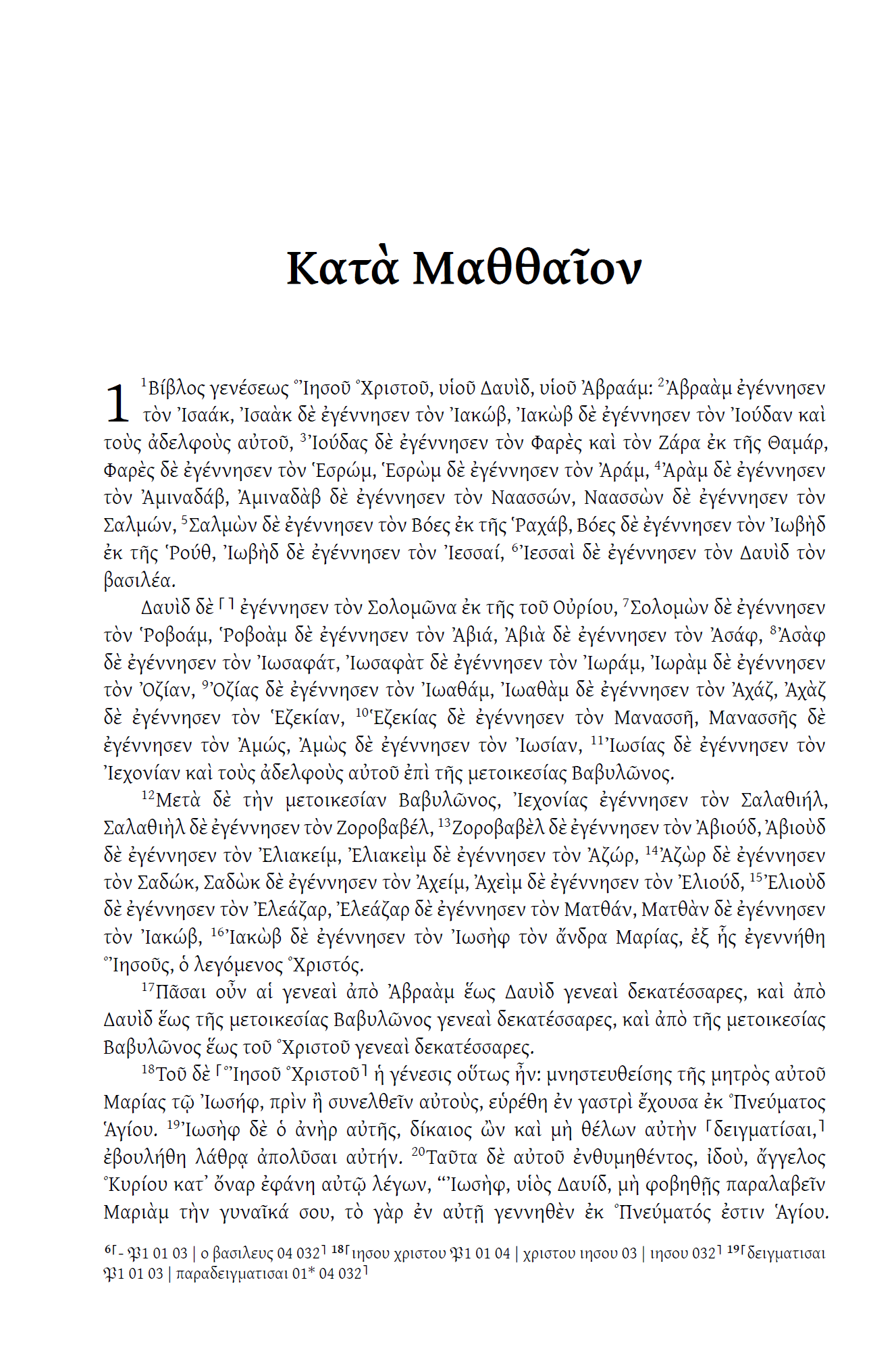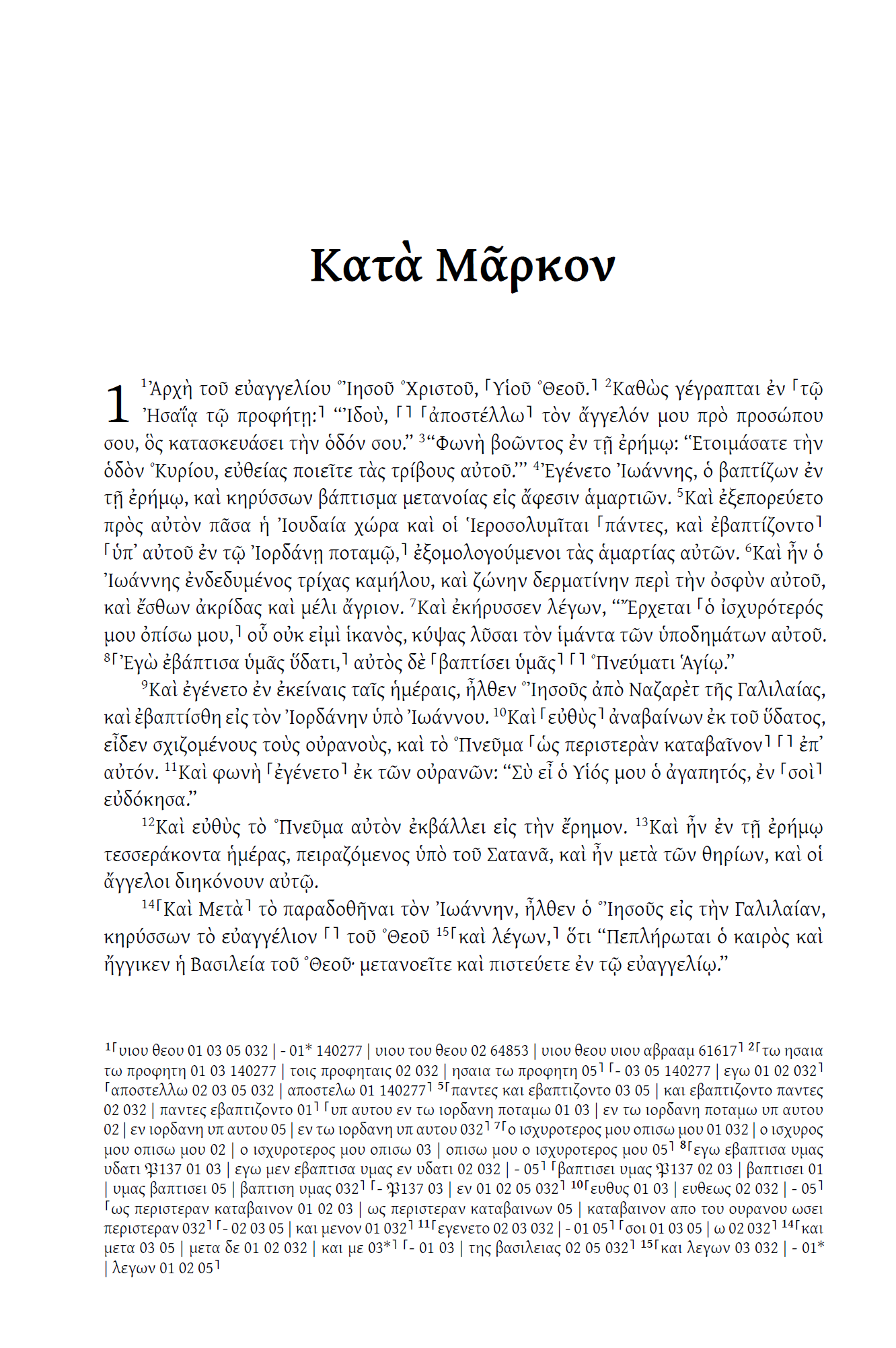 The Statistical Restoration Greek New Testament (SRGNT) is the first computer-generated text derived directly from the earliest manuscript witnesses using an algorithmic statistical model to simulate a reasoned-eclecticism approach, weighing both external and internal evidence in an objective manner. The external evidence is based on statistical reliability, earliness, and diversity of support, and the internal evidence is based on word probabilities within a variant unit and consideration of variant patterns. This process provides a consistently-weighed text without theological bias that is both scientifically inspectable and reproducible, and yet still has close agreement to our best modern critical texts.